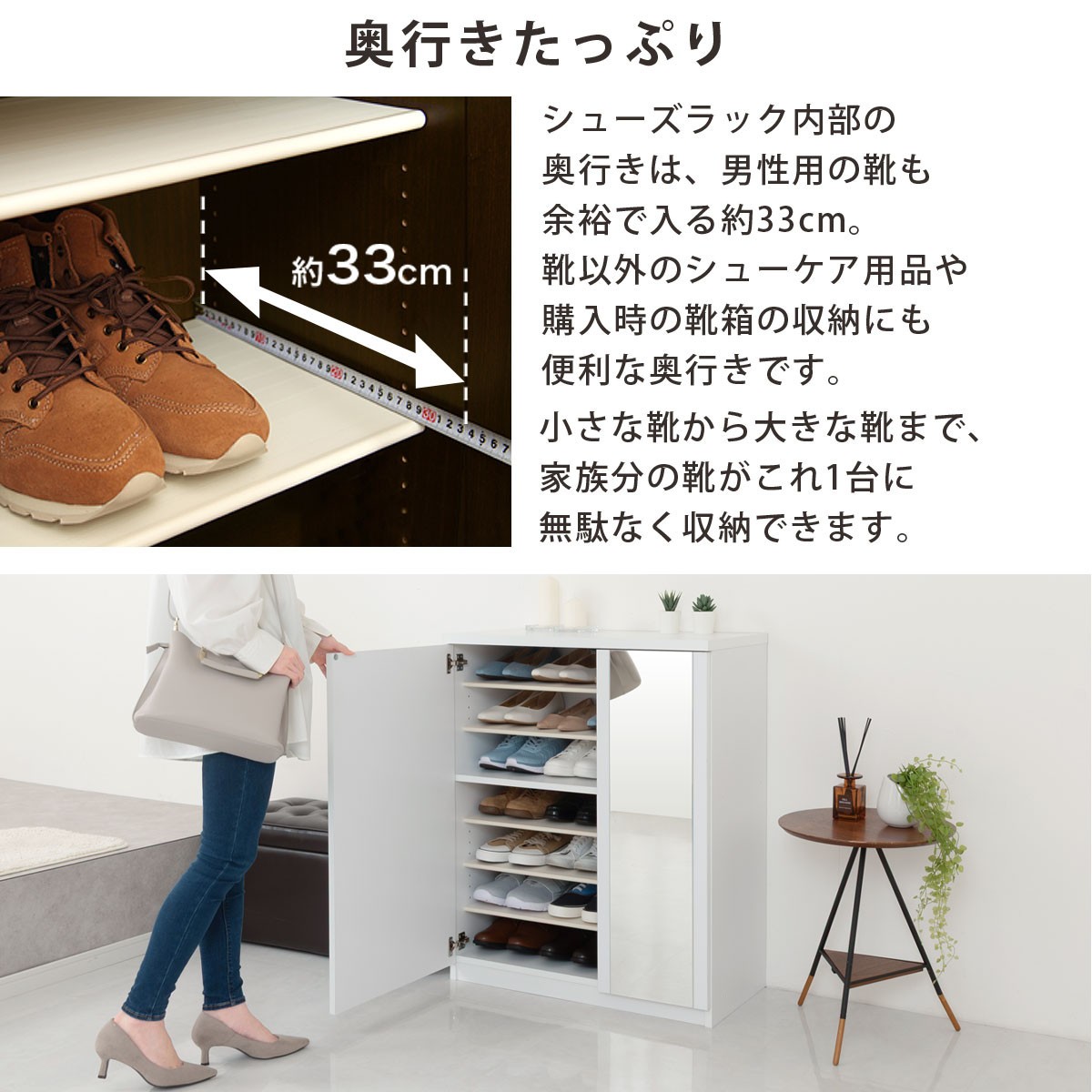 シンプルなデザインで、玄関をすっきり美しく見せるミラー付きのシューズラック。