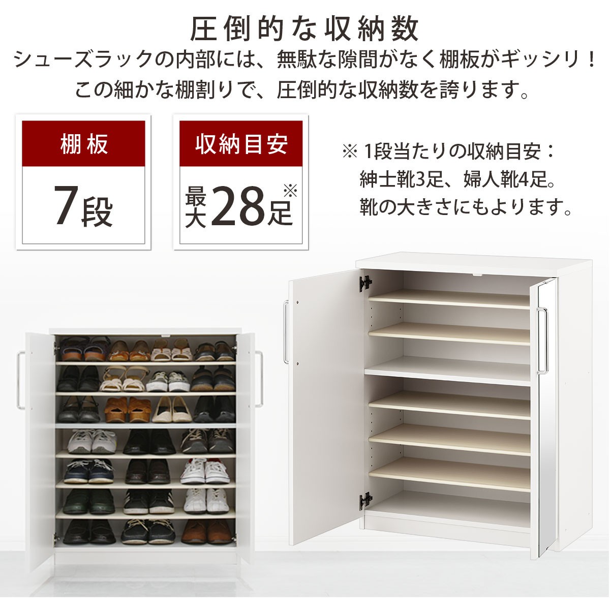 | 容量 | ミラー付きシューズラック ロータイプ/幅75cm(SKANBM175030-0-WH) カラー:ホワイト ■材質 本体、固定棚:プリント化粧板 可動棚:PVC(ポリ塩化ビニル) ■耐荷重 各棚板:約7kg 天板:約10kg (当社調べ) ■最大28足収納可能 ■可動棚5枚 ■ミラー付き ■日本製 ■F☆☆☆☆(低ホルムアルデヒド) ■背面化粧:無し 商品サイズ(約mm) ■商品外寸:幅750×奥行368×高さ925 ■商品重量:約21.5kg |