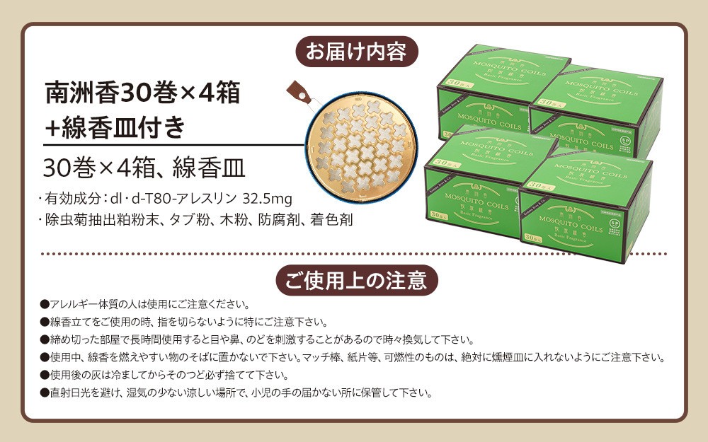 | 容量 | 南洲香30巻×4個+線香皿付き 原産国/製造国:日本 総個数:120巻+線香皿 単品重量:430g/100g 単品(個装)個数:蚊取り線香30巻/線香皿1個 総重量:1820g |