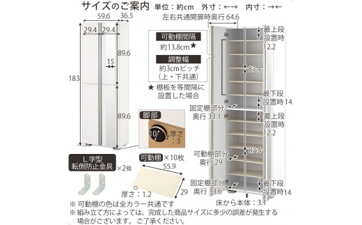 容量 | シューズボックス ミラー付き幅60cm(SKONBM306000) ▼下記よりお選びください タイプ ・鏡が左側 ・鏡が右側 カラー ・オーク ・ウォールナット ・ホワイト ・ホワイトウッド 商品仕様 ■材質 本体、固定棚:プリント化粧板 可動棚:PVC(ポリ塩化ビニル) ■耐荷重 各棚板:約7kg(当社調べ) ■最大36足収納可能 ■可動棚10枚 ■転倒防止金具付き ■日本製 ■F☆☆☆☆(低ホルムアルデヒド) ■背面化粧:無し 商品サイズ(約mm) ■商品外寸:幅596×奥行365×高さ1830 ■商品重量:約30kg |