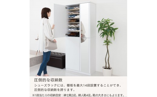 容量 | ミラー付きシューズラック ハイタイプ/幅75cm(SBM075020) カラー:選べる4色 ホワイト、ホワイトウッド、オーク、ウォールナット ■材質 本体、固定棚:プリント化粧板 可動棚:PVC(ポリ塩化ビニル) ■耐荷重 各棚板:約7kg(当社調べ) ■最大56足収納可能 ■可動棚12枚 ■ミラー付き ■転倒防止金具付き ■日本製 ■F☆☆☆☆(低ホルムアルデヒド) ■背面化粧:無し 商品サイズ(約mm) ■商品外寸:幅752×奥行368×高さ1825 ■商品重量:約36.8kg |