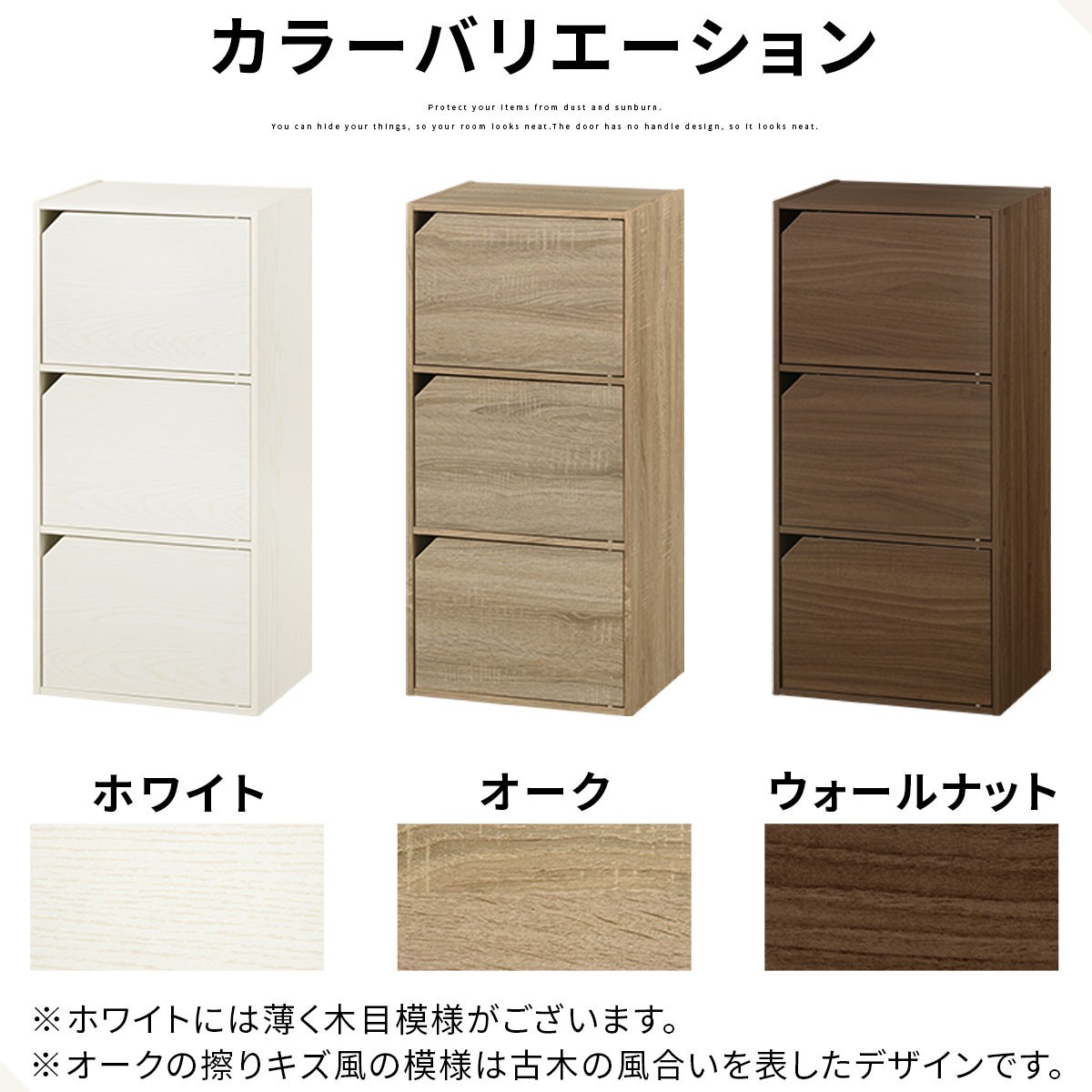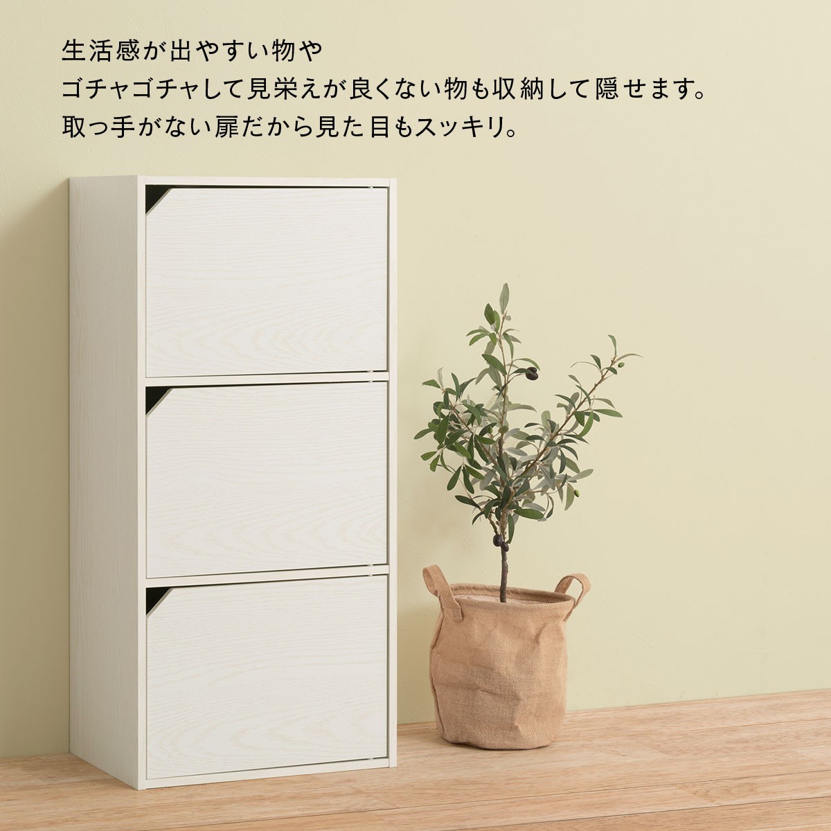 扉付きなのでスッキリ隠せて、収納物をホコリや日焼けから守れる3段タイプのカラーボックスです。