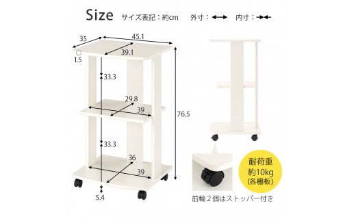 容量 | [ 幅45cm ] キャスター付きテレビ台(TKANVB018119) カラー:選べる3色 ウォールナット、ホワイト、オーク 商品仕様 ■材質:プリント紙化粧繊維板、パーティクルボード ■耐荷重:約10kg(各棚板) ■背面化粧:有り 商品サイズ(約mm) ■商品外寸:幅451×奥行391×高さ765 ■商品重量:約7.2kg |