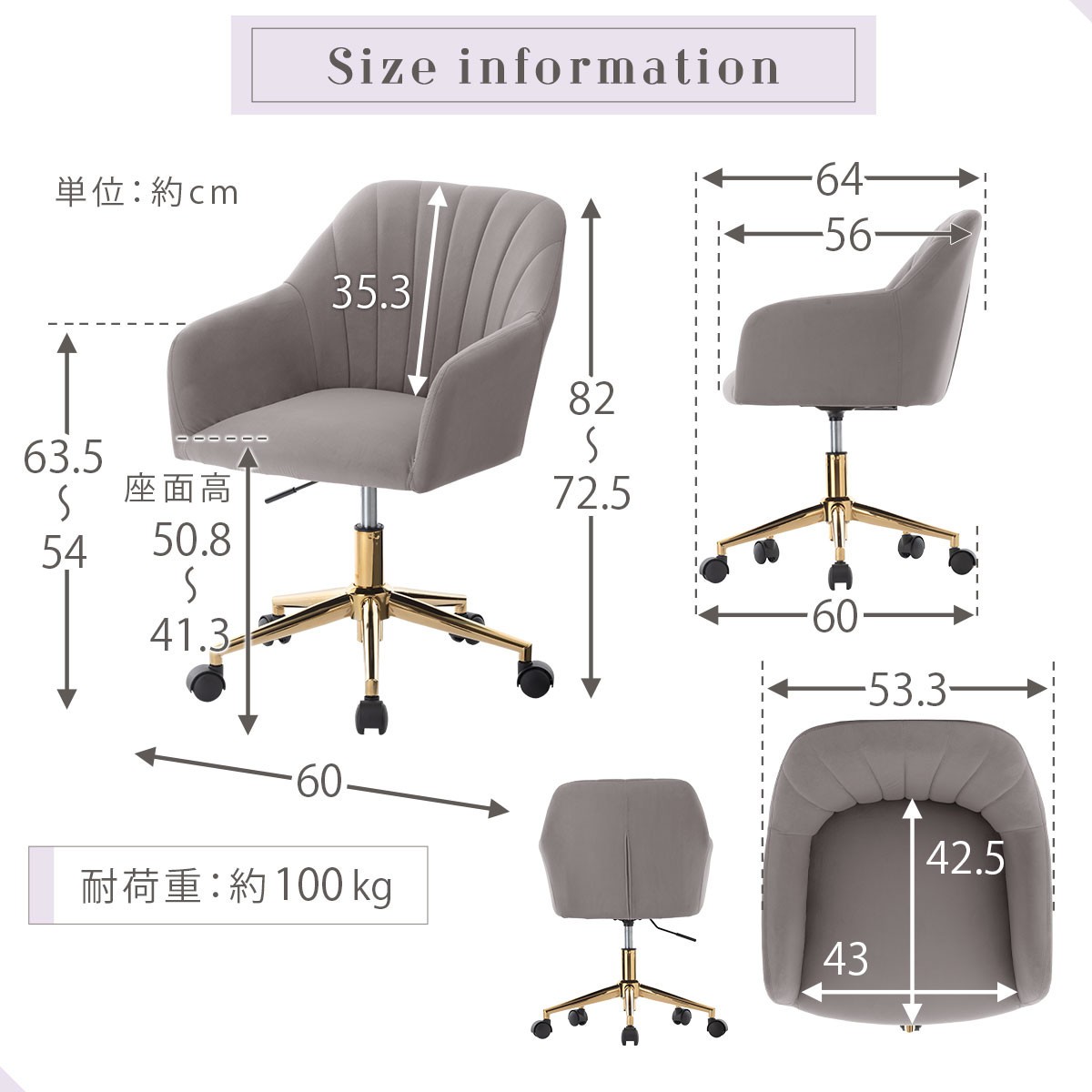 | 容量 | デスクチェア(CKANHR100237) カラー:選べる3色 ベージュ、モーヴピンク、グレー 商品仕様 ■材質 張り材:ポリエステル100% 背部、座部:合板 クッション材:ウレタンフォーム 脚部:スチール(ゴールドメッキ) キャスター:ナイロン ■耐荷重:約100kg 商品サイズ(約mm) ■商品外寸:幅600×奥行640×高さ725~820 ■商品重量:約7.2kg |