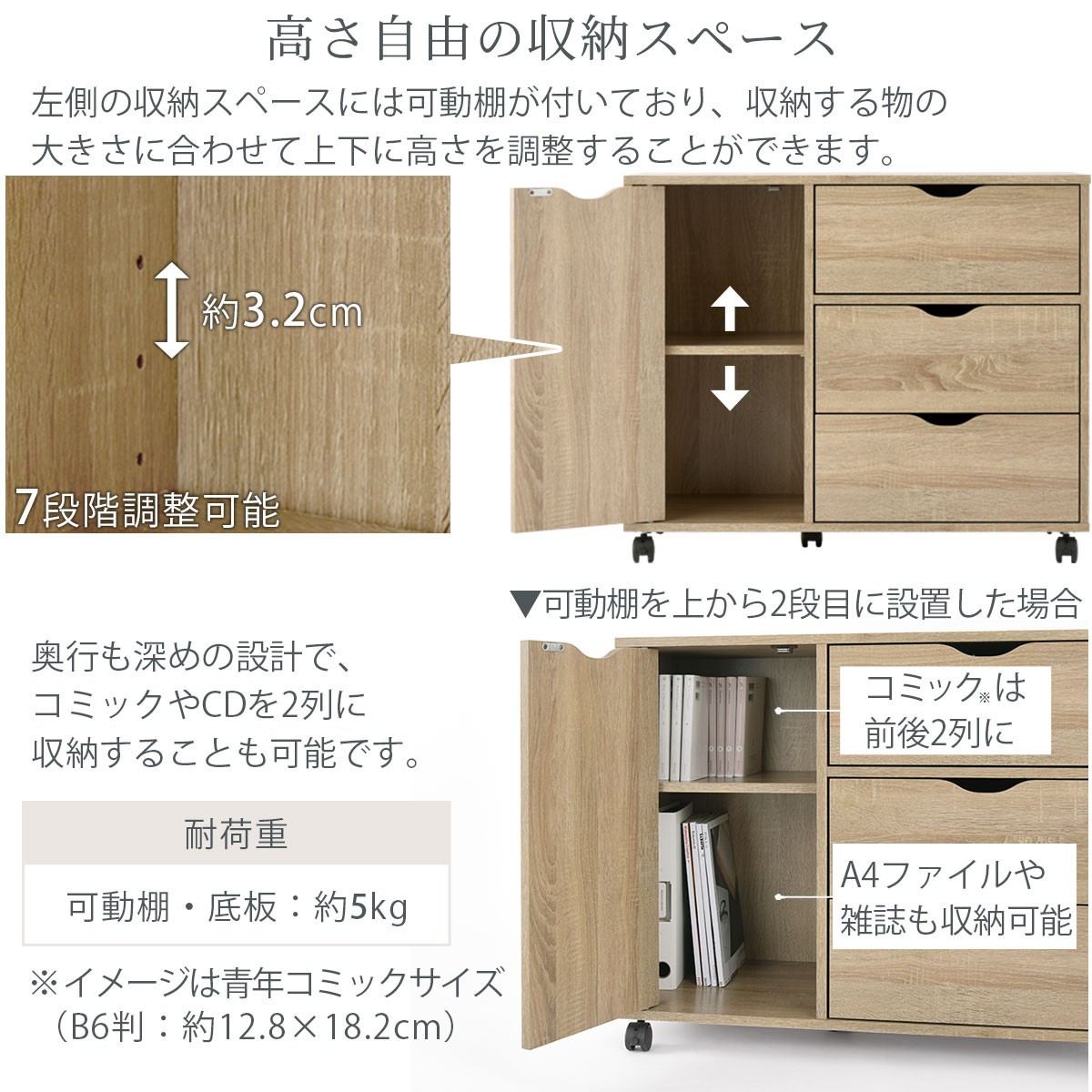 | 容量 | キャスター付きマルチキャビネット(LKANCB642291) カラー:選べる3色 ウォールナット、オーク、ホワイト 商品仕様 ■材質:プリント紙化粧パーティクルボード ■耐荷重 天板:約10kg 各引き出し、棚板、底板:約5kg ■背面化粧:無し 商品サイズ(約mm) ■商品外寸:幅800×奥行395×高さ669 ■商品重量:約23kg |