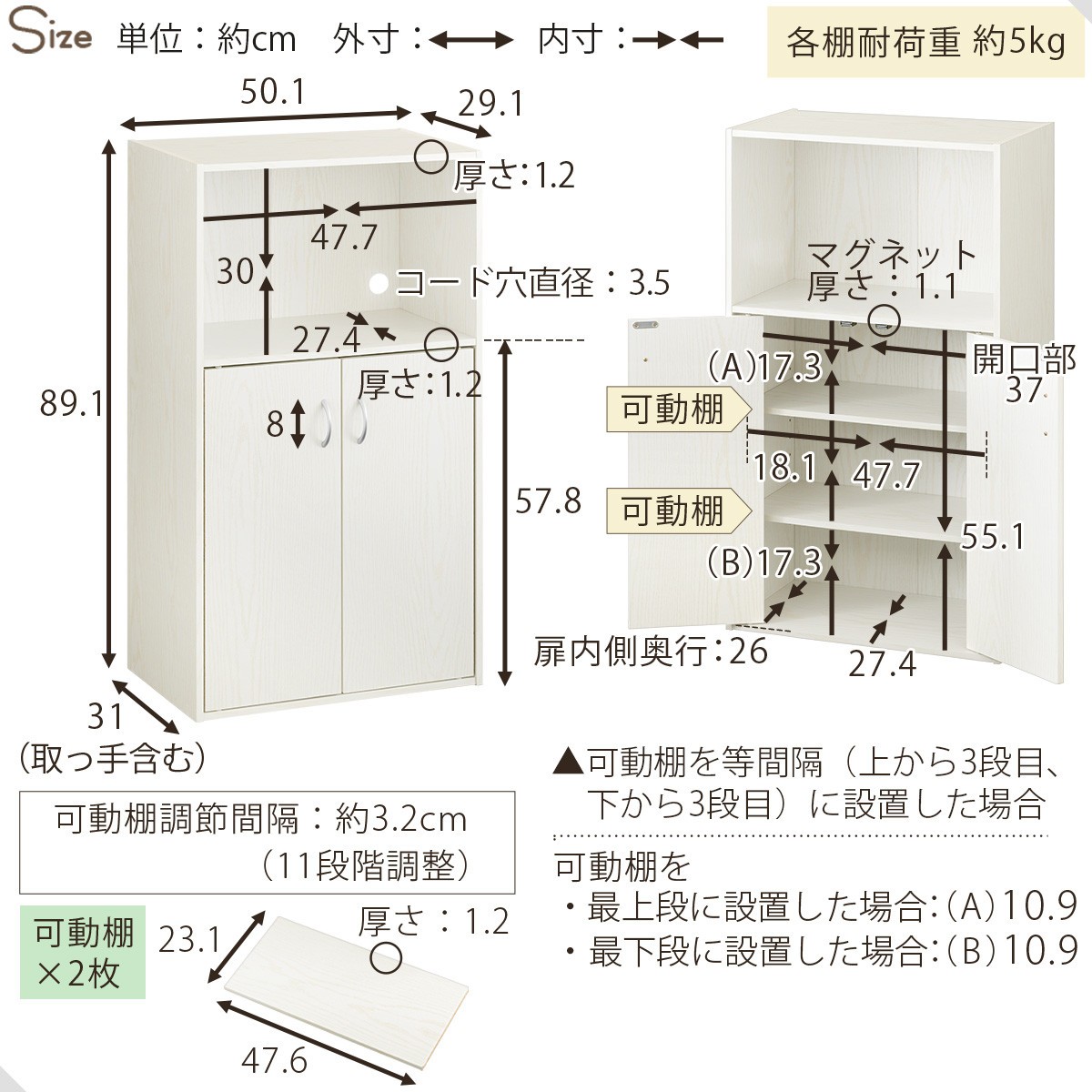| 容量 | 扉付き収納ラック(KKANRA945064) カラー:選べる3色 ウォールナット、オーク、ホワイト 商品仕様 ■材質 本体:プリント紙化粧繊維板 取っ手:プラスチック ■耐荷重:各板約5kg ■背面化粧:無し 商品サイズ(約mm) ■商品外寸:幅501×奥行291(取っ手を含む場合310)×高さ891 ■商品重量:約13.8kg |