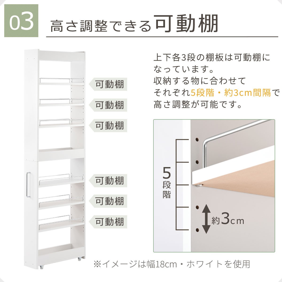 取っ手とキャスター付きで引き出し易く、可動棚で収納力も抜群。スペースを有効活用できます。