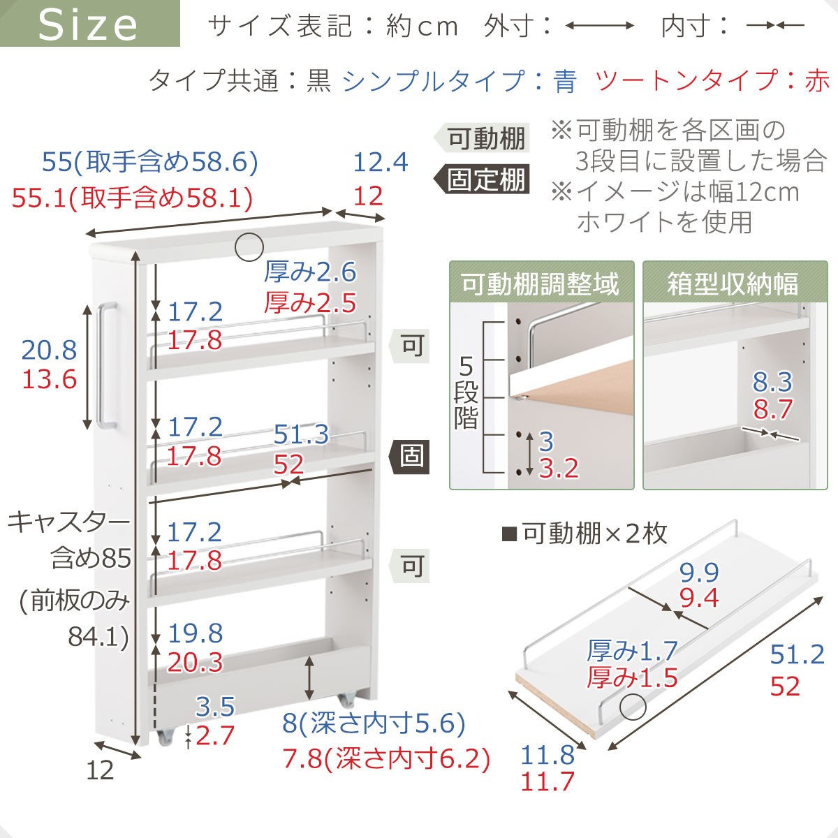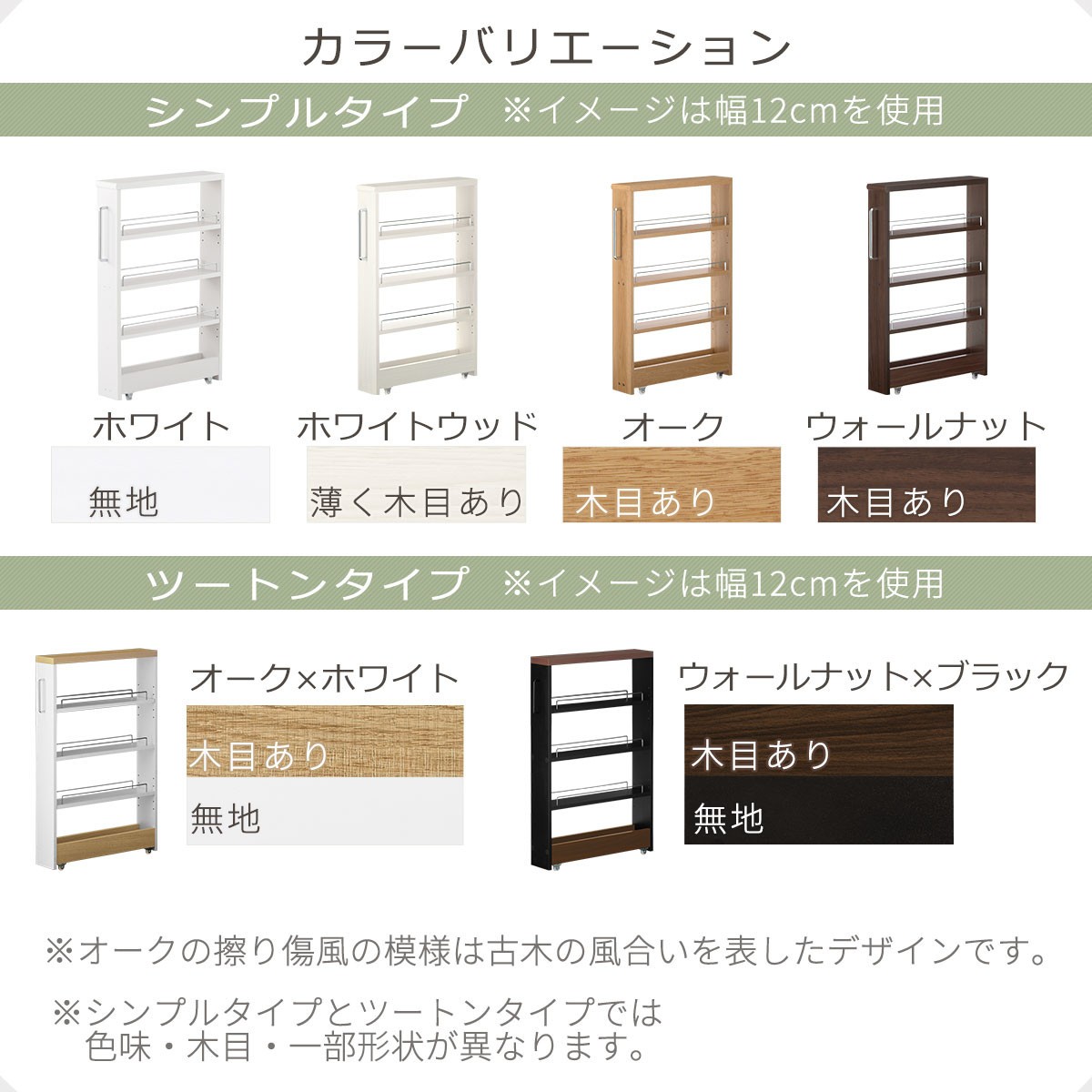 | 容量 | すき間ワゴンラック ロータイプ(KRA945185) ▼タイプとカラーを下記よりお選びください シンプルタイプ ・ホワイト ・ホワイトウッド ・オーク ・ウォールナット ツートンタイプ ・オーク×ホワイト ・ウォールナット×ブラック 【シンプルタイプ】 ■材質 本体:プリント化粧板 ■日本製 ■F☆☆☆☆(低ホルムアルデヒド) 【ツートンタイプ】 ■材質 本体:メラミン化粧繊維板 【タイプ共通】 ■材質 取っ手、転び止め:スチール/クロームメッキ仕上げ ■キャスター付き ■可動棚:2枚 ■中間固定棚:1枚 ■総耐荷重:約20kg ※一段に集中しての収納はご遠慮ください。 ■背面化粧:有り 商品サイズ(約mm) 【シンプルタイプ】 【幅12cm】 ■商品外寸:幅124×奥行550×高さ850 ■商品重量:約5.2kg 【ツートンタイプ】 【幅12cm】 ■商品外寸:幅120×奥行551×高さ850 ■商品重量:約6.5kg |