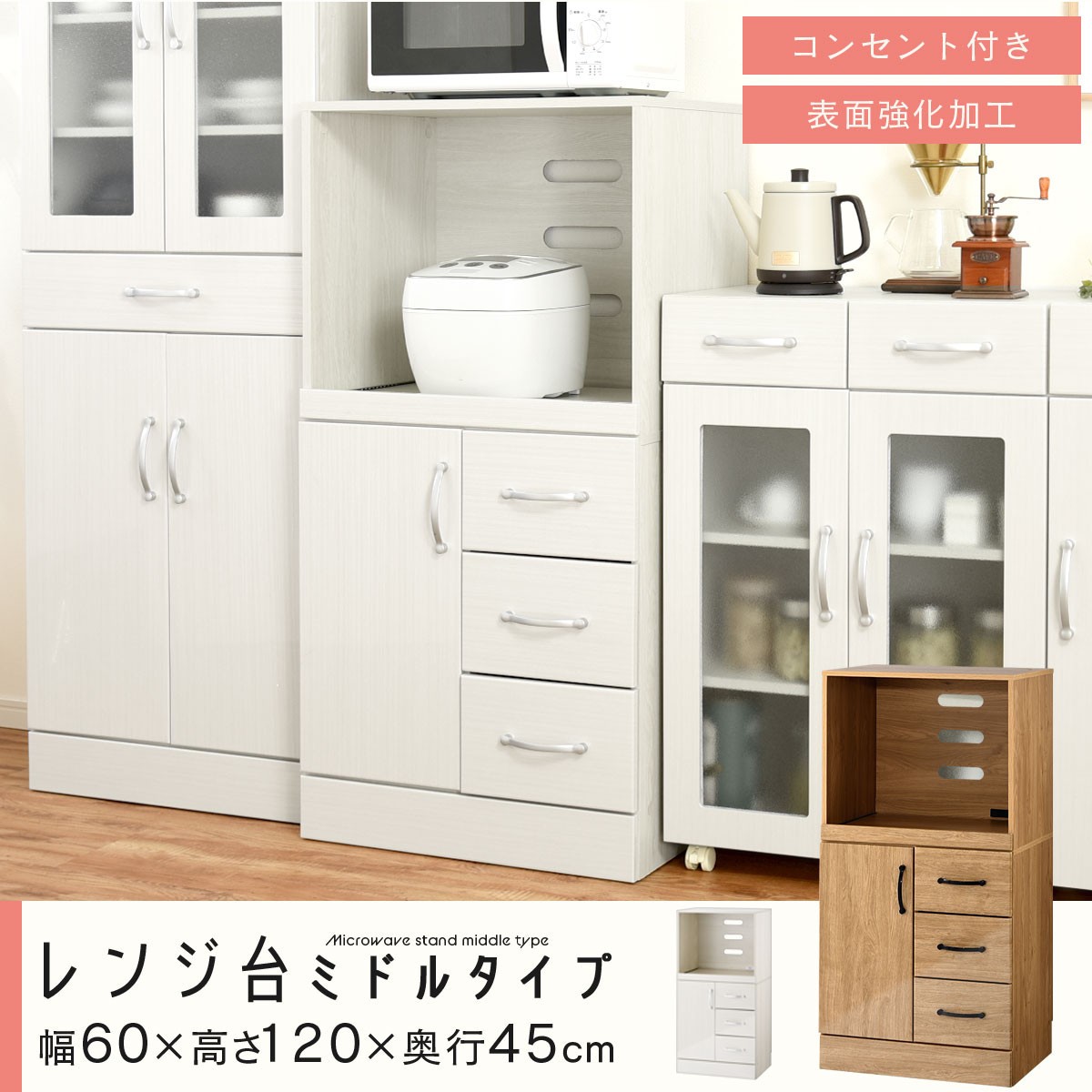 チョイス公式ポイント交換対象 【完成品でお届け】キッチン収納〔レンジ台・ミドルタイプ〕(選べる2色)レンジ台 幅60 レンジラック 木製 レンジボード 食器棚 ラック コンセント付き 約 奥行45 高さ120 cm キッチンラック KKANCBJ01130