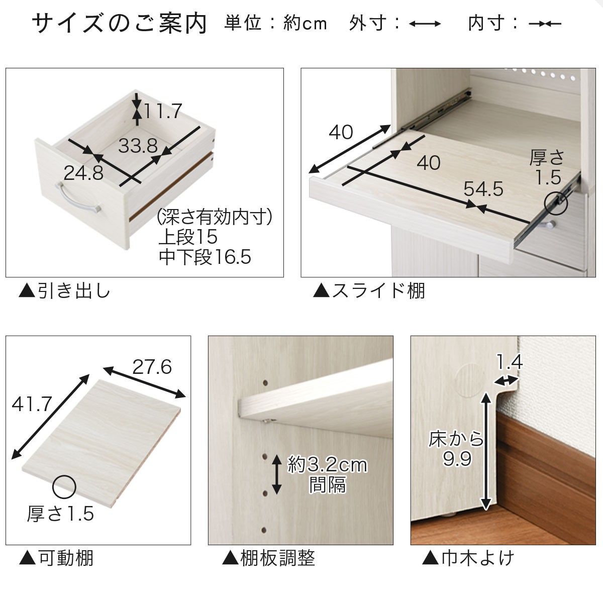 | 容量 | キッチン収納〔レンジ台・ミドルタイプ〕(KCBJ01130) 選べるカラー:ナチュラル、ホワイト 商品仕様 ■材質 本体:化粧繊維板 強化紙貼り 扉・引き出し前板:化粧繊維板 PVCハイグロスシート貼 取っ手:プラスチック ■耐荷重 天板:約20kg、スライド棚:約10kg、可動棚:約5kg、固定棚:約5kg、各引き出し:約5kg ■コンセント付き ■背面化粧:無し 商品サイズ(約mm) ■商品外寸:幅600×奥行450×高さ1200 ■商品重量:約36.9kg |
