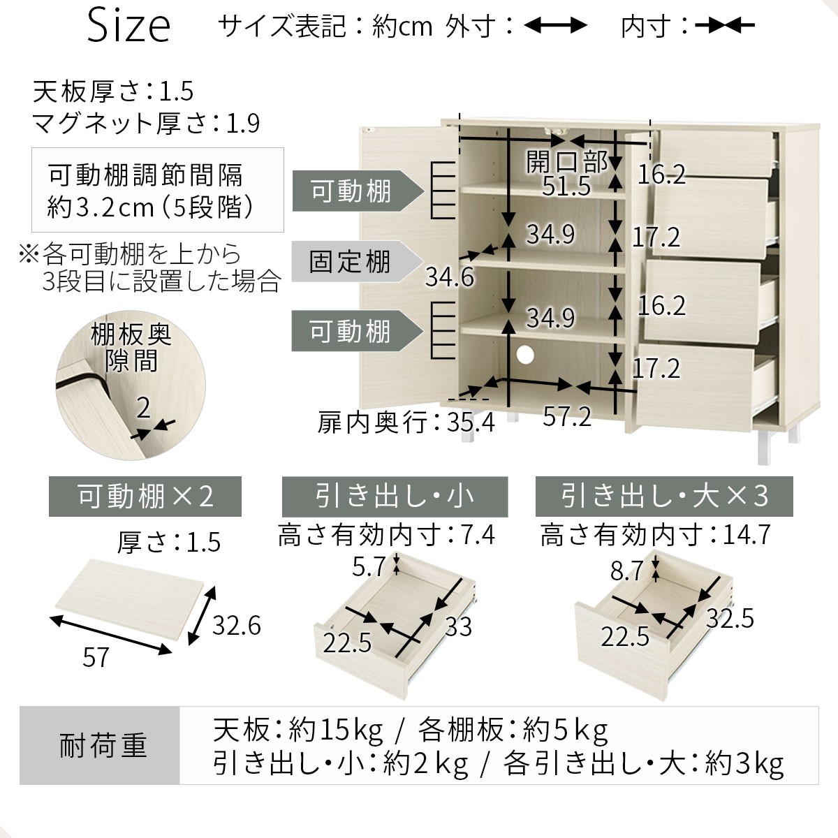 | 容量 | キャビネット〔Aタイプ〕(TVB018120) カラー:ホワイト 商品仕様 ■材質 本体:プリント化粧繊維板(メラミン化粧板貼り) 脚部:スチール(粉体塗装) ■耐荷重 天板:約15kg 各棚板:約5kg 引き出し小:約2kg 各引き出し大:約3kg ■背面化粧:有り 商品サイズ(約mm) ■商品外寸:幅902×奥行402×高さ830 ■商品重量:約37.1kg |