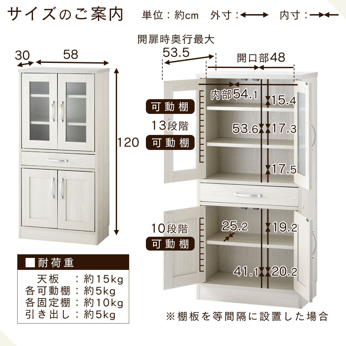 | 容量 | キッチン収納〔食器棚・ミドルタイプ〕(KCB000015) 選べるカラー:ナチュラル、ウォールナット、ホワイト 商品仕様 ■材質 本体:化粧繊維板 ガラス:強化ガラス5mm厚 取っ手:プラスチック ■耐荷重 天板:約15kg、各可動棚:約5kg、各固定棚:約10kg、引き出し:約5kg ■背面化粧:無し 商品サイズ(約mm) ■商品外寸:幅580×奥行300×高さ1200 ■商品重量:約22.6kg |