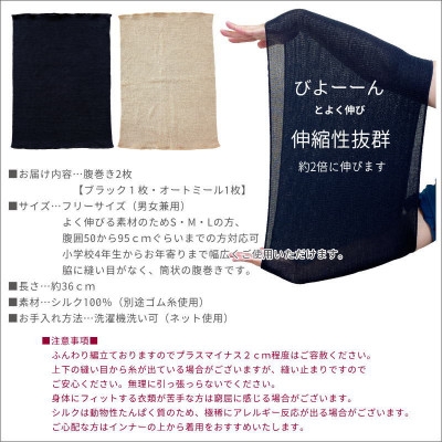 | 容量 | ■お礼品の内容について ・男女兼用シルク腹巻き【ブラック1枚・オートミール1枚】[2枚] 製造地:和歌山県橋本市 ■原材料・成分 シルク100%(別途ゴム糸使用) |