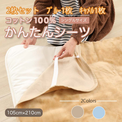 <2枚セット>シーツ 敷毛布 かんたんシーツ キャメル ×ブルー シングル 綿100% 4隅ゴム付き【1512652】