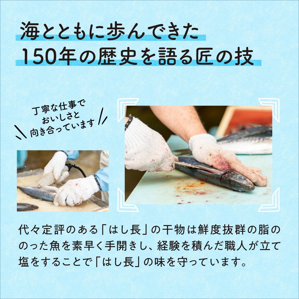 私たち「はし長」は慶応元年創業、150年の歴史を持つ老舗鮮魚店です。目利きと技術を代々引き継ぎながら地元御坊が誇る魚介の旬の味を提供し続けています。代々定評があるのは素材の鮮度を塩加減に一切の妥協のない「干物」。脂ののった魚を素早く手開きにし、魚の色合いで塩加減を判断します。獲れてすぐに瞬間冷凍した魚を使い、最低限に留めた素早い太刀入れで鮮度を保っています。魚の肉質も日ごとに違うため経験を積んだ職人が立て塩をすることで「はし長」の味を守っています。先代が試行錯誤の上完成させた秘伝の出汁を使ったとこぶしの煮付けもご提供させていただきます。