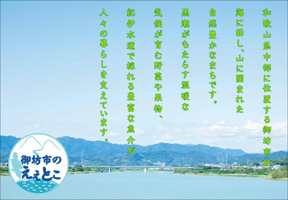 御坊市は、紀伊半島のほぼ中央部に位置し、海山川に囲まれた豊かな自然と黒潮海流による温暖な気候に育まれた歴史、文化が息づくまちです。