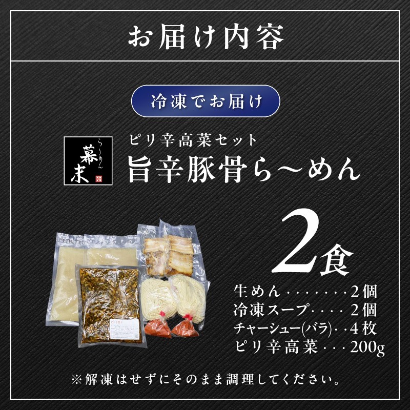 チョイスPayポイントと交換できる品 お店そのままの味と風味をご家庭でもお楽しみいただけます。 旨辛豚骨ら~めん(2食入り)・ピリ辛高菜セット