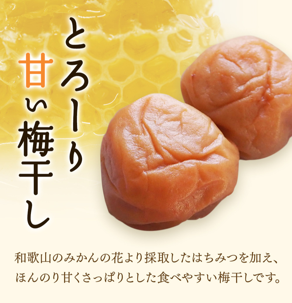 紀州のみかん畑で採集された蜂蜜を入れた梅干は、とてもまろやかな味わいで、酸っぱさが苦手な方にもお勧めです。(塩分約5%)
