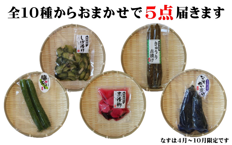全10種からおまかせで5点お届け! おまかせ5点セット / 漬物 冷蔵 ごはんのおとも 大根 きゅうり 白菜 古漬 梅漬け キムチ 浅漬け ぬか漬け 和歌山 田辺市【ksn002】