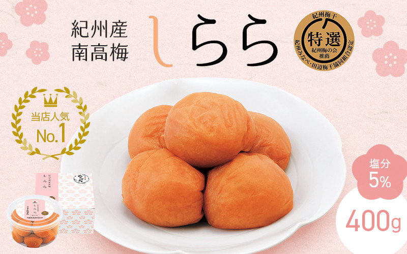 ふっくり柔らか、ぽってり肉厚、とろける食感。 紀州産南高梅 梅干し しらら (塩分5%)400g / A級品 梅干し 梅干 梅 中田食品 和歌山 田辺 紀州南高梅 南高梅 うす塩 減塩 塩分控えめ ご飯のお供【nkt010-1】