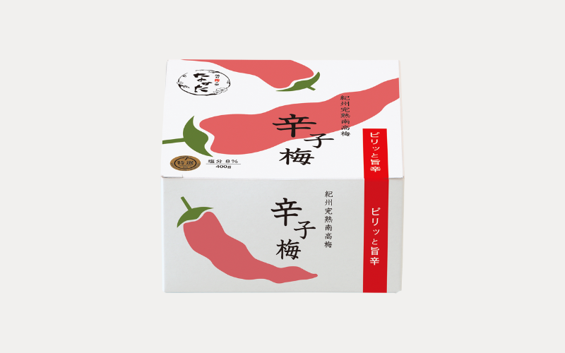 紀州産の南高梅を、まろやかな甘口にじっくり漬け込み、仕上げにピリッと辛い唐辛子をたっぷりまぶしました。