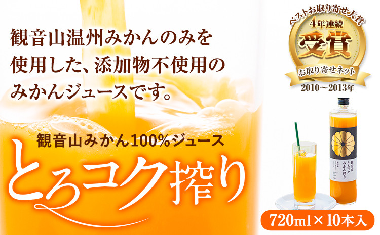チョイスPayポイントと交換できる品 観音山温州みかんのみを使用した、添加物不使用のみかんジュースです。 観音山みかんジュース「とろコク搾り」720ml×10本入 有限会社柑香園 《30日以内に出荷予定(土日祝を除く)》和歌山県 紀の川市 フルーツ 果物 柑橘 添加物不使用 100%ストレートジュース