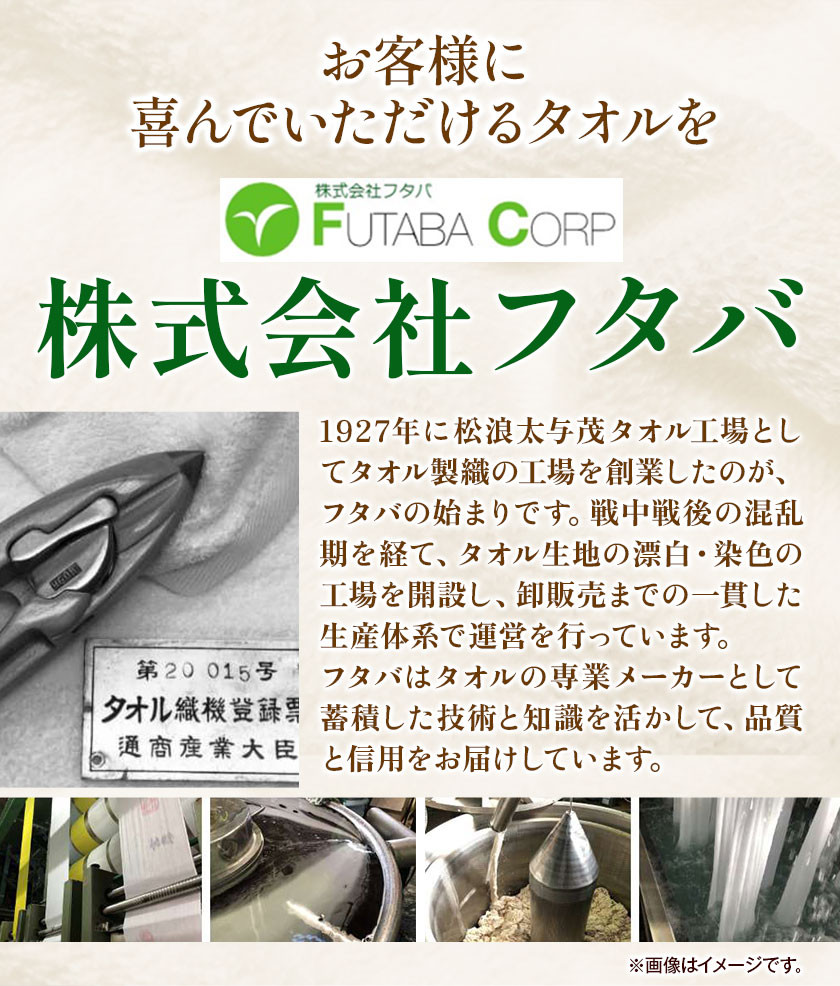 フタバでは1927年の創業から一貫してタオル製作に携わってまいりました。先代から受け継いだ知識と、ものづくりに対する経験は弊社にとってはかけがえのない非常に貴重な資源であると考えております。この資源を最大限に活かして、いつの時代においてもお客様が満足できる価値観と品質を提供できるよう日々努力してまいります。