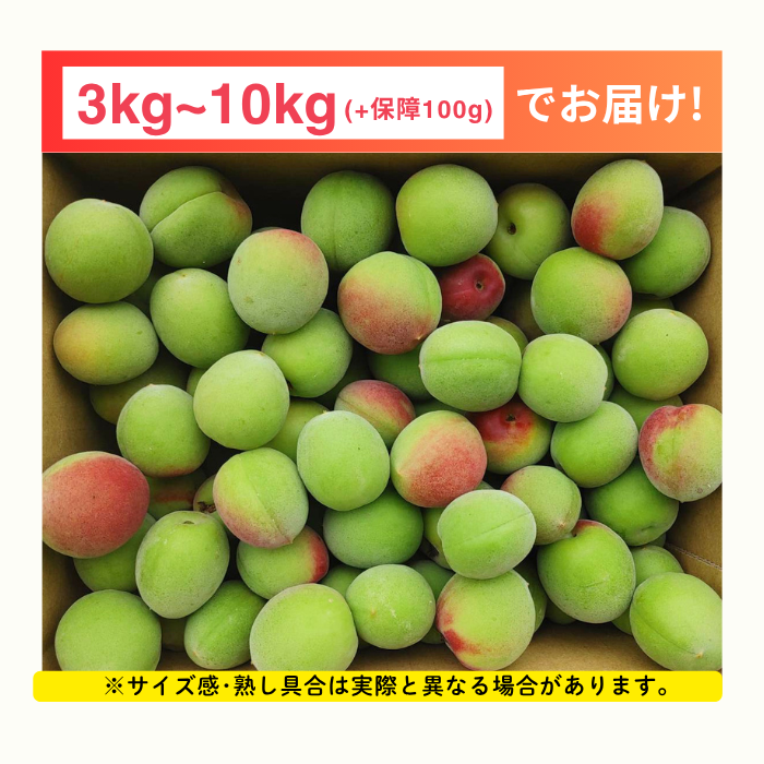 ※気温の上昇により、青梅をご注文の場合でも、お届け時に完熟になっている場合もあります。ご了承くださいませ。サイズにばらつきがあり、小さな傷があるため、かなりお得な価格でご提供しています。
