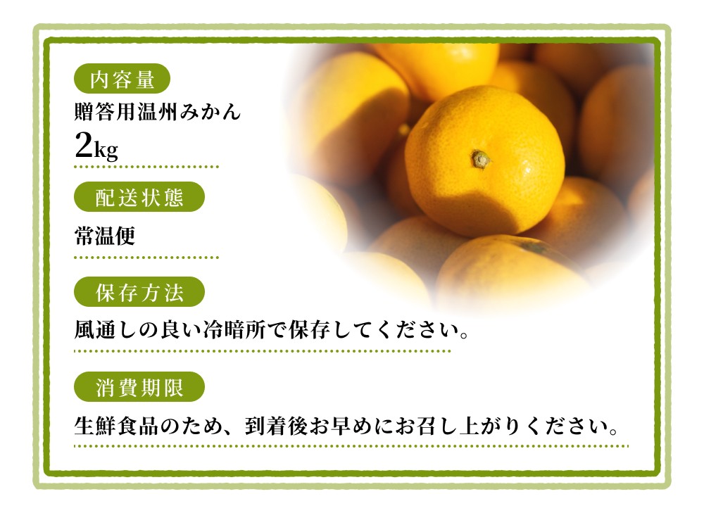 | 容量 | 贈答用みかん 約2kg 品種:みかん(和歌山県海南市下津町産) 保存方法:風通しの良い冷暗所にて保存ください |