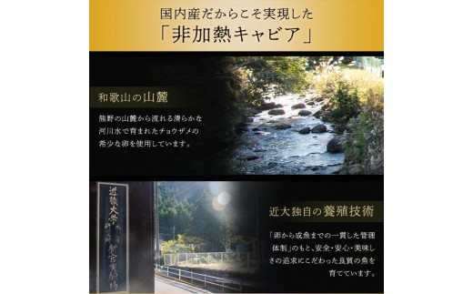 【発送時期】順次発送(予定) 【賞味期限】加工日より364日(要冷凍(-18℃以下)) 近畿大学独自の養殖技術と和歌山の清流が作り出した「近大キャビア」は国内生産により実現した「非加熱キャビア」です。 一切の加熱処理を行わずに「マイナス40℃の凍結処理」を経て冷凍保管を行っているため、お召し上がりの際にはタンパク質が硬化せずに魚卵らしい非常にクリーミーな味わいを感じることができます。また、キャビア本来の香りもしっかりと感じていただけます。 チョウザメの卵と岩塩のみで加工し、無着色です。一般的なキャビアに比べて塩分が控えめなため、キャビア本来の風味を楽しんでいただけます。 ☆プレミア和歌山(優良県産品推奨制度)認定品です。 ◆おすすめの食べ方 バゲットやクラッカーに無塩バターを添えたカナッペや、スパークリングワインにもよく合います。 ◆おすすめの用途 特別な日のお食事やギフトなど。 ---- 水産養殖のパイオニアである近畿大学水産研究所の研究成果である「近大キャビア」です。 高級食材として有名なカスピ海産のキャビアが採れるチョウザメは、乱獲が進み絶滅が危惧されている状態です。持続可能な食糧の確保という観点でも、養殖キャビアは注目されている産業分野です。今後も、近大キャビアを「日本のキャビア」として多くの方に親しんでいただけように、価格・味・安全性・さまざまな面で皆様に選んでいただきやすいキャビアを目指しています。 ◆保存方法 要冷凍(-18℃以下) 解凍・開封されましたら、再冷凍はせず、その日のうちにお召し上がりください。 【こちらは和歌山県により優れた県内産品として、プレミア和歌山に認定されている白浜町の返礼品です】 平成31年総務省告示第179号第5条第8号ロ「都道府県が当該都道府県の区域内の複数の市区町村と連携し、当該連携する市区町村の区域内において前各号のいずれかに該当するものを当該都道府県及び当該市区町村の共通の返礼品等とするもの」に該当する返礼品として出品しているものです。 【製造場所】 和歌山県新宮市高田1330 学校法人近畿大学水産研究所新宮実験場 事業者 :アーマリン近大 連絡先 :0739-42-4116