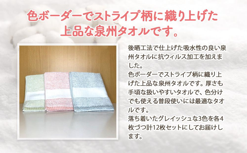 【発送時期】入金確認後、30日以内に発送いたします。 後晒工法で仕上げた吸水性の良い泉州タオルに抗ウィルス加工を加えました。色ボーダーでストライプ柄に織り上げた上品な泉州タオルです。 厚さも手頃な扱いやすいタオルで、色分けでも使える普段使いには最適なタオルです。 落ち着いたグレイッシュな3色を各4枚づつ計12枚セットにしてお届けします。 【原材料】綿100% 【こちらは岩出市との共通返礼品になります】 平成31年総務省告示第179号第5条第8号イ「市区町村が近隣の他の市区町村と共同で前各号いずれかに該当するものを共通の返礼品等とするもの」に該当する返礼品として出品しているものです。 製造地:和歌山県岩出市 事業者名:株式会社フタバ 連絡先:072-463-1721