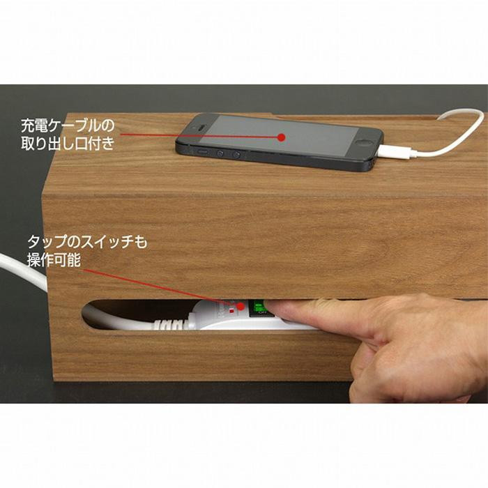 本体の手前側には細長い小窓を設けており、スイッチ付きのOAタップを収納しても小窓からスイッチ操作が可能。節電などでON/OFFしたい時もカバーを外さずに操作でき便利です。本体の後側は差込み板が上下にスライドする仕組み。ケーブル類は左右どちらの窓からも出すことができます。天板にはケーブルを出せる小窓付きで、スマートフォンなどの充電ケーブルを出して天板の上を充電スペースに利用できます。