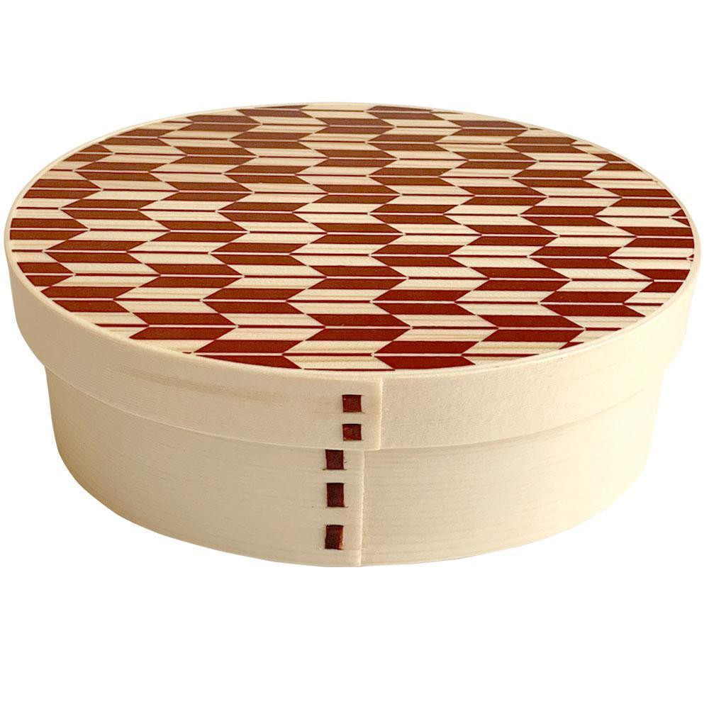 曲げわっぱのお弁当箱2個セットです、白木の弁当箱に紀州漆器の職人が矢羽柄をシルクスクリーンで絵付けした逸品です。