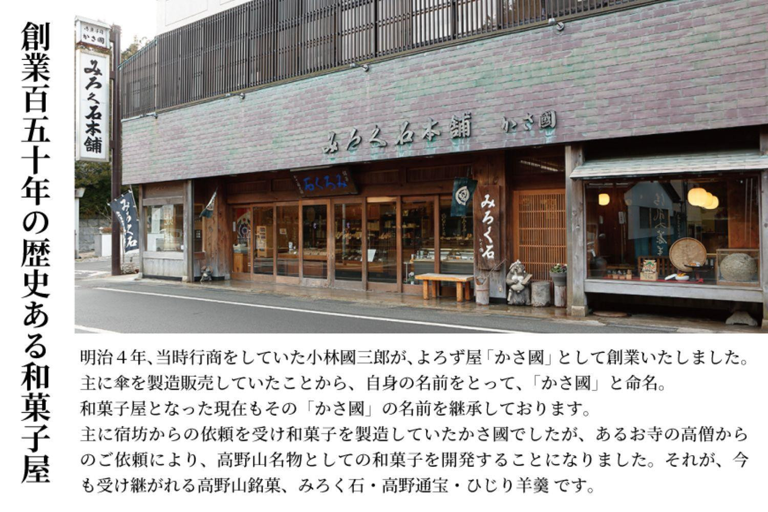 高野山の前官(ぜんがん)(=位の高いお坊さん)が、かさ國に高野山の名物となる菓子を「みろく石」という名で名物にすることを三代目小林に依頼されました。