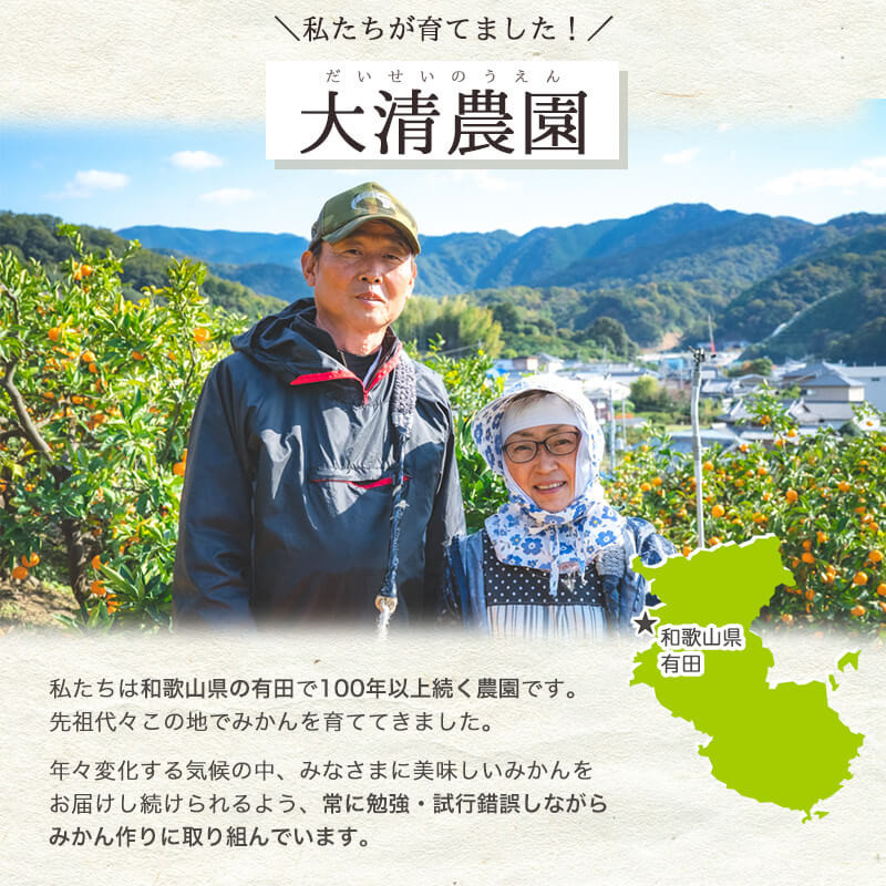 大清農園はみかんの里、和歌山県の有田で100年以上続く農園で、先祖代々この地でみかんを育ててきました。