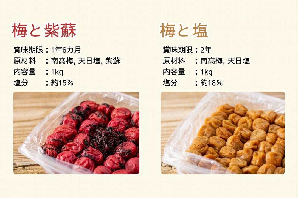 | 消費期限 | ・梅と塩 1kg:製造日から2年 ・梅と紫蘇 1kg:製造日から1年6ヶ月 |