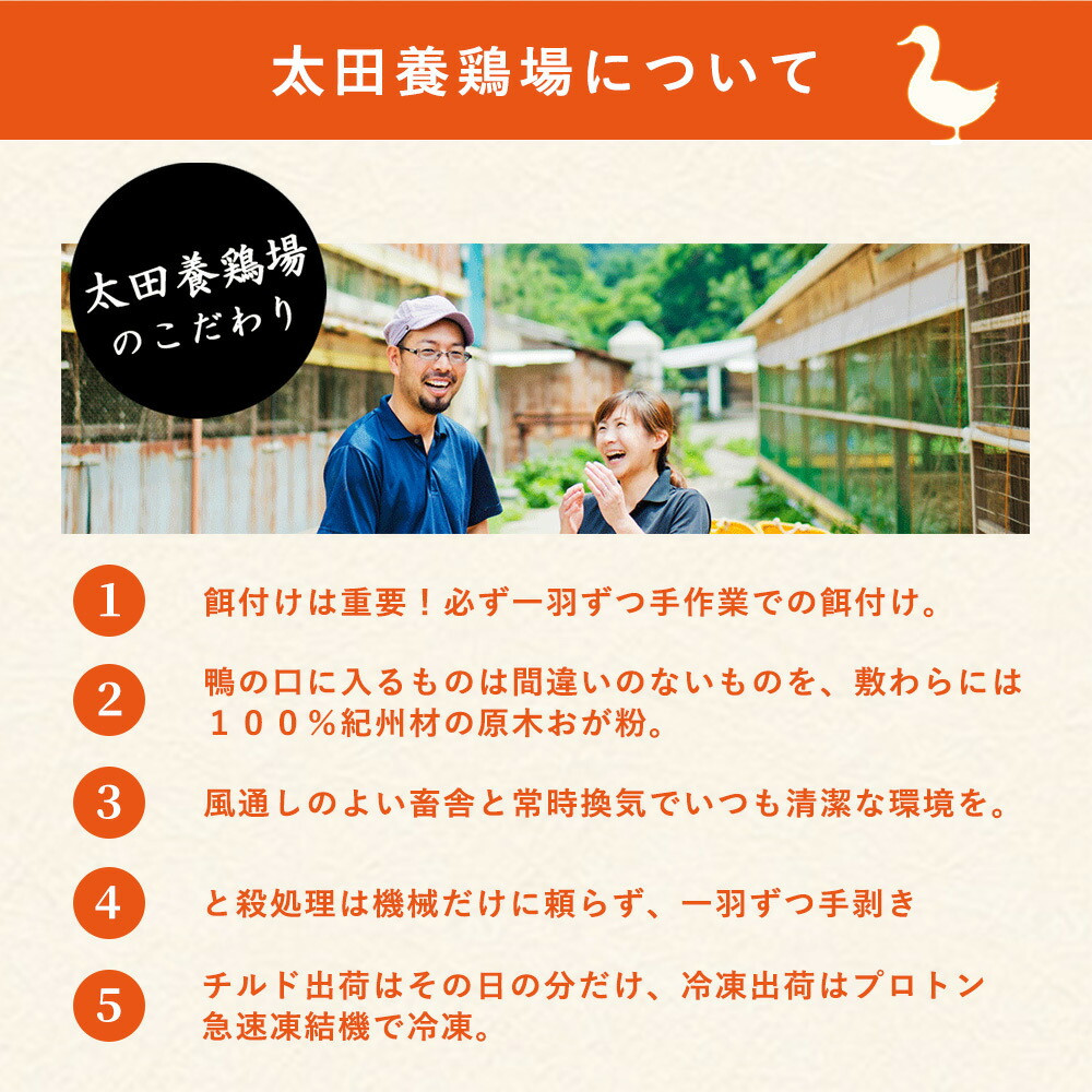風通しの良い畜舎で一年中浜風を受け、山から流れてくる谷水を飲み、独自配合のペレット飼料を食べ、紀州材100%のおが粉の敷料の上で育った鴨は、真っ白い脂と鮮やかな赤みの肉のコントラストが美しい外観を持ち、鴨肉独特の臭みが少ない、しかしながら濃厚な脂のコクがある最高級の紀州鴨になります。