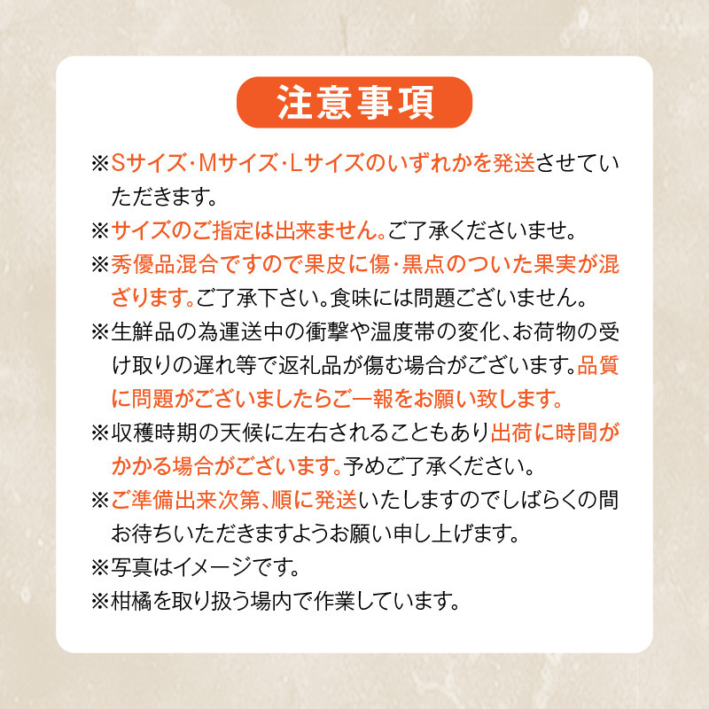 こちらのお礼の品は極早生品種のみかんです。秀品と優品が混ざった規格で、みかんの大きさはSサイズ・Mサイズ・Lサイズのいずれか均一サイズになります。サイズは画像などでご確認下さい。