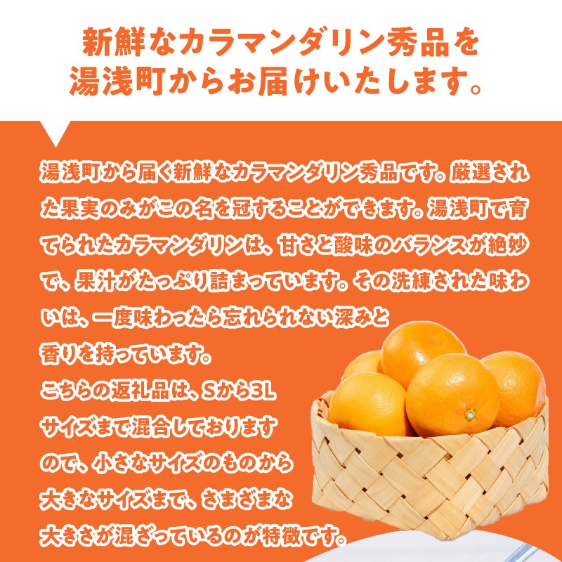 サイズはS~3Lサイズが混合に入っています。5kgと十分な量がありますので、日々の食生活にも十分対応します。和歌山県湯浅町産のカラマンダリン秀品で、新鮮な味わいをお楽しみください。