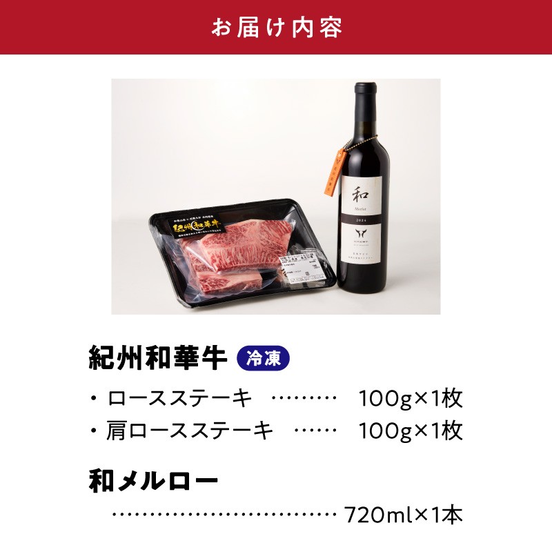 チョイスPayポイントと交換できる品 有田で育った紀州和華牛と、100%有田産のワインをお楽しみください EM6114_紀州和華牛ロースステーキ100g・肩ロースステーキ100g&和メルロー2024 【紀州和華牛 和メルロー 詰め合わせ 国産 和歌山産 食べ比べ 霜降り ロース 肩ロース ブランド 黒毛和牛 和牛 牛肉 お肉 赤ワイン メルロー 和洋折衷 アルコール お酒 お取り寄せ 和歌山県 湯浅町 送料無料】