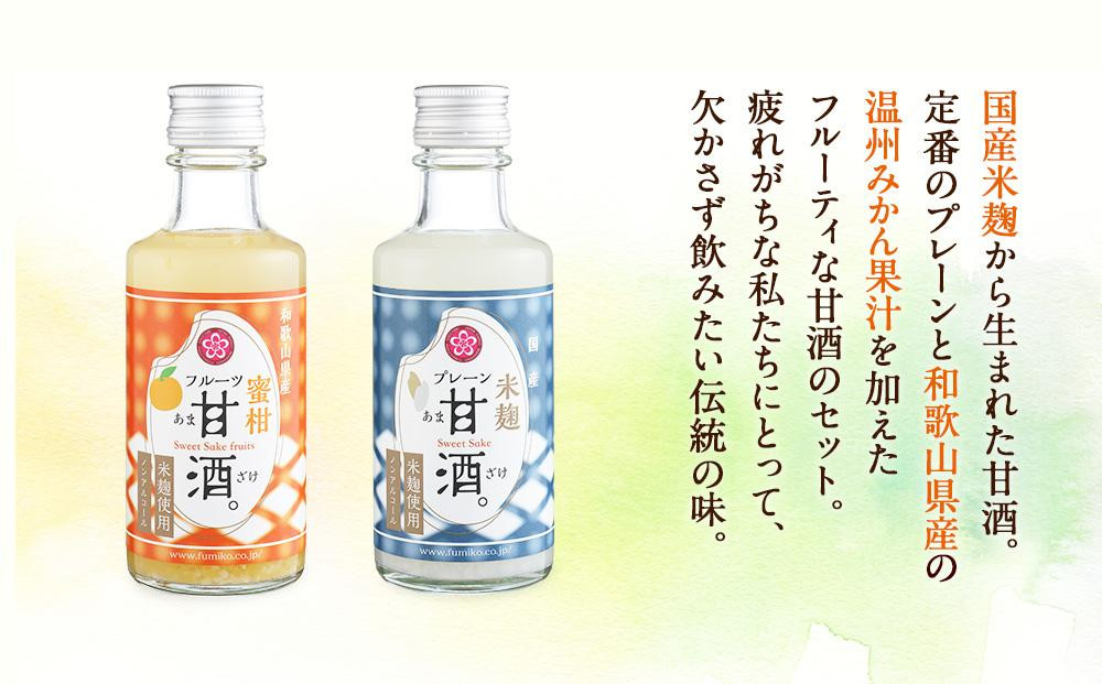 国産米麹から生まれた甘酒。定番のプレーンと和歌山県産の温州みかん果汁を加えたフルーティな甘酒のセット。