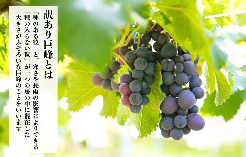 訳あり巨峰とは種あり巨峰を作る際に出来た種あり粒と種なし粒が一つの房に沢山混在してしまった巨峰です。巨峰は受粉すると種を作り粒が大きくなり、受粉しなかったものは種がないまま小ぶりな粒に成長します。この種が入らなかった粒を房が大きくなる前に摘果し、粒が大きくなるのを予測しながら巨峰の形を整えていくのですが、受粉量が少ない房や天候により摘果が間に合わなかった房は形を整える事が出来ず種あり粒、種なし粒が混在した房が出来上がってしまいます。ひとつの房で種ありと種なしが食べられるのでお得と言う方もおられますが、どちらとも取れない商品の為規格外商品、訳あり品となります。生育環境は同じ、木も同じ愛情いっぱいに育てていますのでご賞味頂けたらと思います。