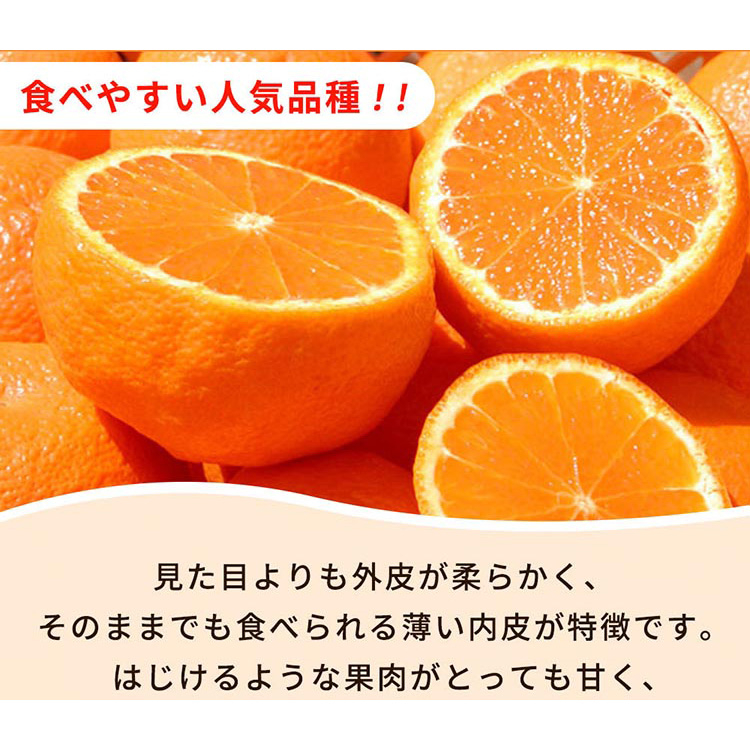 「清見」と「ポンカン」の交配によりできた柑橘で、清見のジューシーさとポンカンの甘味を受け継いだ品種です。まろやかな甘さだけじゃなく程良い酸味も味わえます。 ジューシーで、甘くてコクのあるプリップリの果肉をお届けします。剥きやすい外皮と、そのまま食べられる薄い内皮が特徴です。お口いっぱいでお楽しみ下さい。