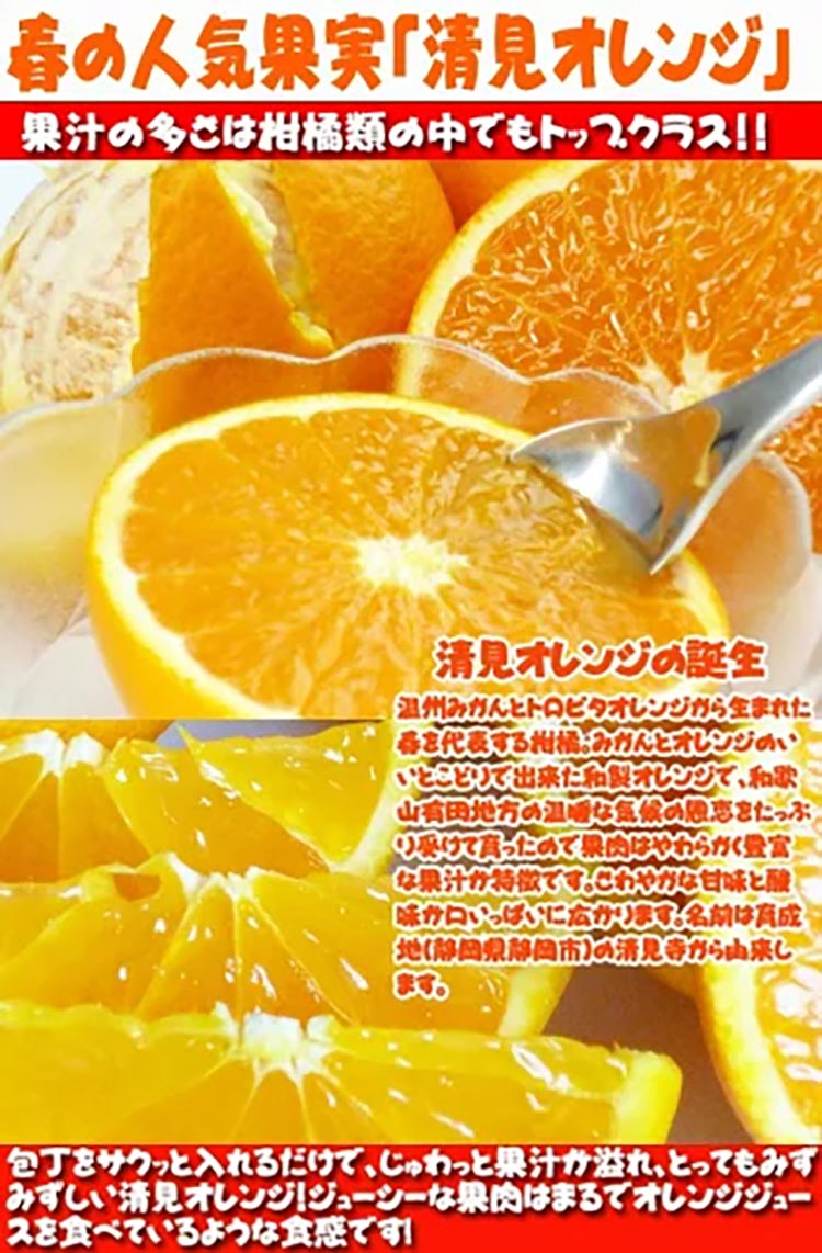 とろける果肉とほとばしる果汁感がたまらない清見オレンジです。和歌山県は全国有数の柑橘生産地。温暖な気候と太陽の恵みが、濃厚でジューシーな果汁たっぷりの清見オレンジを育てました!春の柑橘として人気が高い品種で、温州みかんの甘みとオレンジの香りを受け継いだ魅力あふれるフルーツです。 デコポン・ポンカンと並び“平成の三大柑橘”とも呼ばれています。