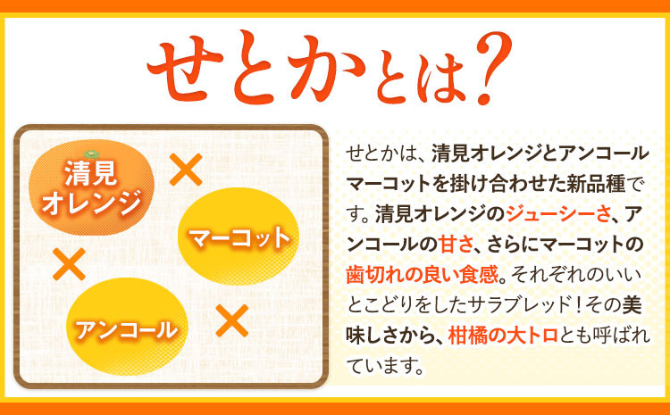 せとかとは清見オレンジとアンコール、マーコットを掛け合わせた新品種です。清見オレンジのジューシーさ、アンコールの甘さ、さらにマーコットの歯切れの良い食感。それぞれのいいところどりをしたサラブレッドしているため、果物好きの方にはぜひ一度食べていただきたい一品です。