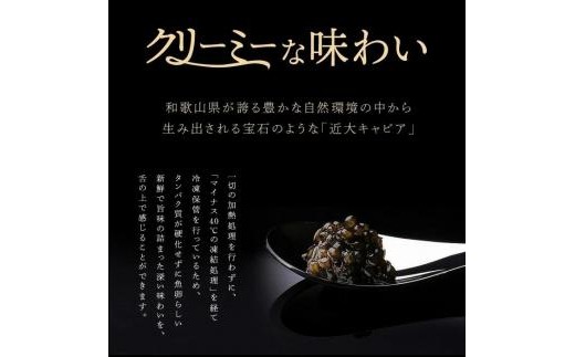 【発送時期】順次発送(予定) 【賞味期限】加工日より364日(要冷凍(-18℃以下)) 近畿大学独自の養殖技術と和歌山の清流が作り出した「近大キャビア」は国内生産により実現した「非加熱キャビア」です。 一切の加熱処理を行わずに「マイナス40℃の凍結処理」を経て冷凍保管を行っているため、お召し上がりの際にはタンパク質が硬化せずに魚卵らしい非常にクリーミーな味わいを感じることができます。また、キャビア本来の香りもしっかりと感じていただけます。 チョウザメの卵と岩塩のみで加工し、無着色です。一般的なキャビアに比べて塩分が控えめなため、キャビア本来の風味を楽しんでいただけます。 ☆プレミア和歌山(優良県産品推奨制度)認定品です。 ◆おすすめの食べ方 バゲットやクラッカーに無塩バターを添えたカナッペや、スパークリングワインにもよく合います。 ◆おすすめの用途 特別な日のお食事やギフトなど。 ---- 水産養殖のパイオニアである近畿大学水産研究所の研究成果である「近大キャビア」です。 高級食材として有名なカスピ海産のキャビアが採れるチョウザメは、乱獲が進み絶滅が危惧されている状態です。持続可能な食糧の確保という観点でも、養殖キャビアは注目されている産業分野です。今後も、近大キャビアを「日本のキャビア」として多くの方に親しんでいただけように、価格・味・安全性・さまざまな面で皆様に選んでいただきやすいキャビアを目指しています。 ◆保存方法 要冷凍(-18℃以下) 解凍・開封されましたら、再冷凍はせず、その日のうちにお召し上がりください。 【製造場所】 和歌山県新宮市高田1330 学校法人近畿大学水産研究所新宮実験場 事業者 :アーマリン近大 連絡先 :0739-42-4116