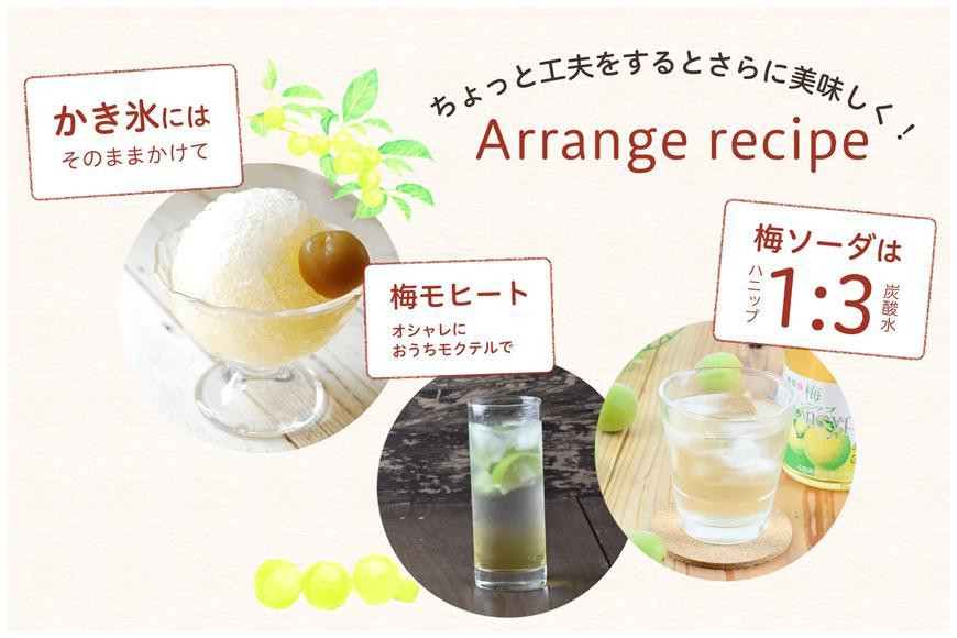 希釈用梅ドリンク 2種類のセット 梅ハニップ ■ ご自宅で簡単に梅ジュースが作れます。 ■ お水で割れば、梅ジュースに、サイダーで割れば、梅サイダーに、 ■ 焼酎のお湯割りにいれても! 完熟梅ハニップ ■ ご自宅で簡単に梅ジュースが作れます。 ■ 朝食のヨーグルトにはそのままかけてお召し上がりください。 ■ アレンジしてお菓子作りにも使って頂けます。 どちらも4倍希釈ですので、ご自宅で簡単に梅ジュースが作れます。 お水で割れば、梅ジュースに、サイダーで割れば、梅サイダーに! 焼酎のお湯割りにいれても美味しくいただけます。 夏場はかき氷シロップにもどうぞ。 アレンジすれば熱中症対策ドリンクにも使って頂けます。 500mlボトルで作る熱中症対策 梅ドリンク ウメネードのレシピ ・梅ハニップ ペットボトル1/8くらい=62.5ml 大さじ4杯程度(おこのみの濃度でOK) ・塩 ひとつまみ 0.5~1.0g ・水(炭酸水でも可) 事業者名:プラム食品株式会社 連絡先: 0739-47-2895