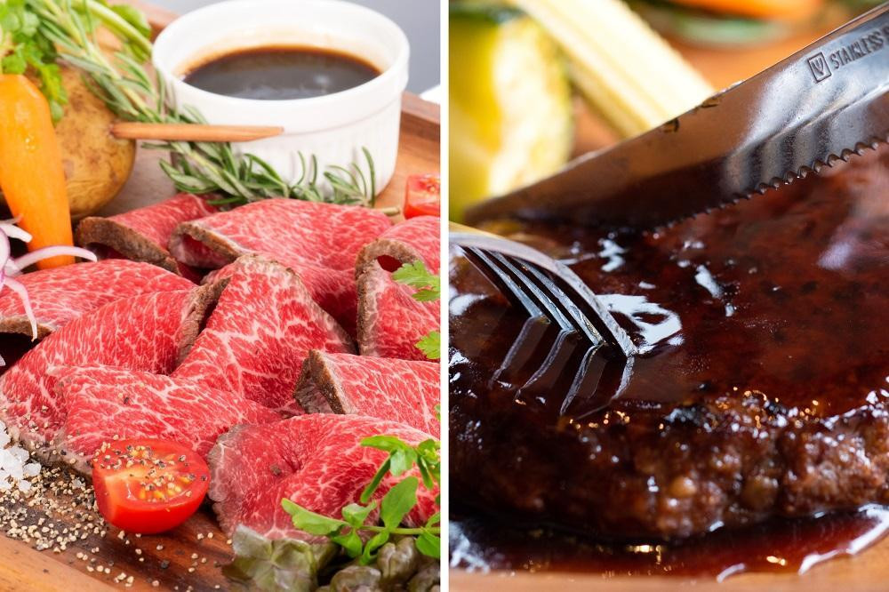 贅沢に熊野牛のみで作ったジューシーなハンバーグと、熊野牛の柔らかい部位を使用し、素材の旨味を存分に生かしたこだわりのローストビーフのセットです。