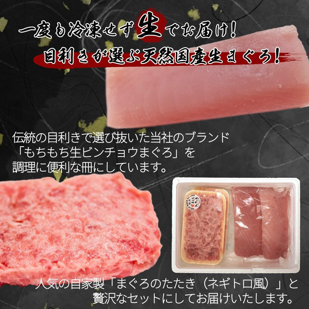 伝統の目利きで選び抜いた当社のブランド「もちもち生ビンチョウまぐろ」を調理に便利な冊にしています。