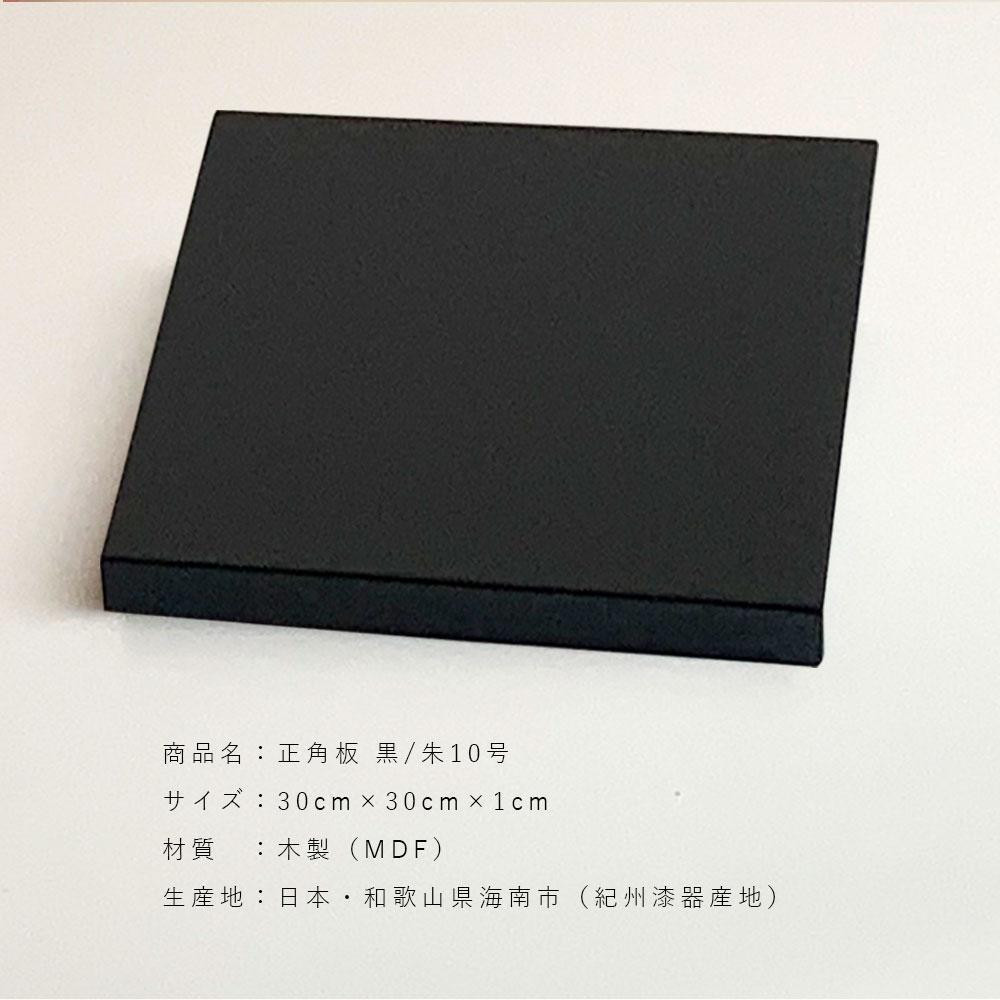 | 容量 | 商品名:木製正角板 黒/朱 10号(30cm) サイズ:30cm×30cm×0.9cm 素材:木製(MDF) 塗装:カシュー塗り 生産地:和歌山県海南市(紀州漆器産地) |